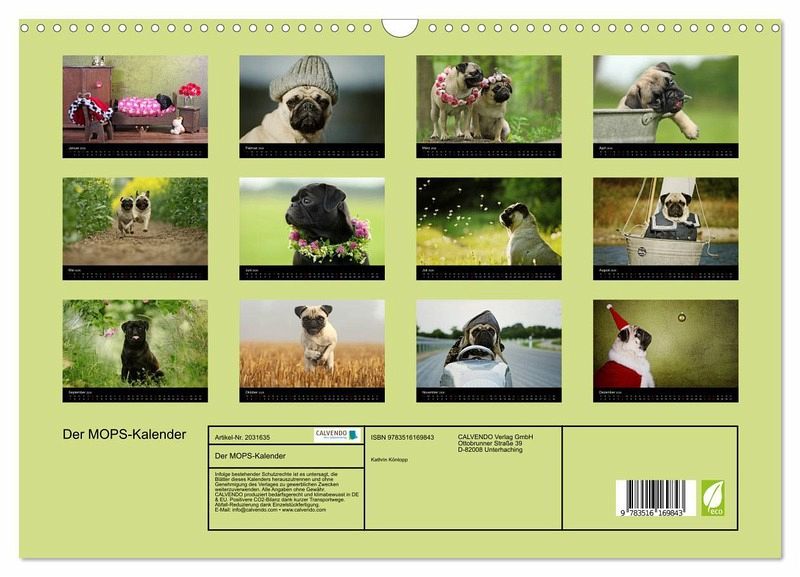 Für alle Mops-Fans oder diejenigen, die es werden wollen hat Kathrin Köntopp von der Hundeknipserei 13 schöne und bunte Bilder aus dem Leben der süßen Möpse ausgewählt ... viel Spaß mit dem Lebenskünstler MOPS. Dieser Kalender gehört zu den CALVENDO-Topsellern
