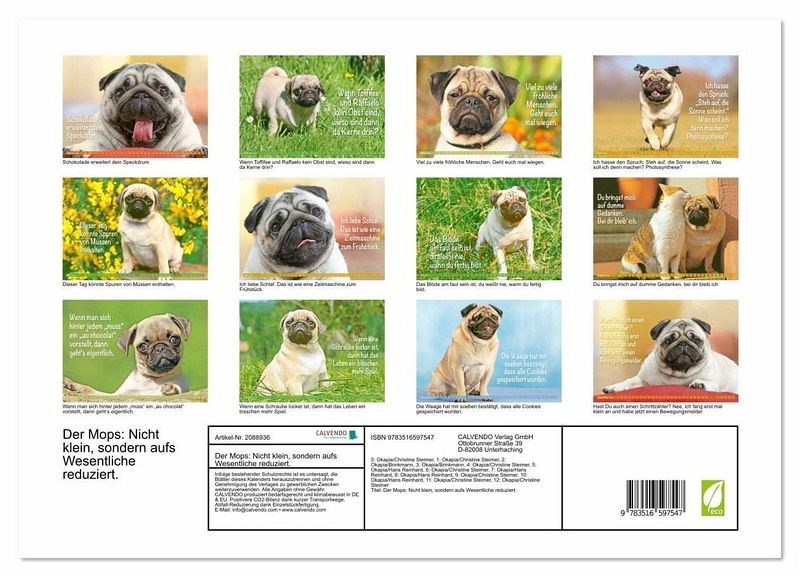 QUALITÄT - Hochwertiger Fotokalender mit 12 wunderschönen Motiven auf lichtbeständigem Bilderdruckpapier, robuste Spiralbindung mit Aufhängebügel.NACHHALTIG - deutliche Abfallreduzierung durch bedarfsgerechte Einzelstückfertigung, umweltfreundliches FSC-zertifiziertes Papier, Produktion in Deutschland, klimabewusste Logistik.PERFEKTES GESCHENK - Kalender für Freunde und Familie, für Kinder und Erwachsene, jung und alt, zu Weihnachten, Geburtstag oder zwischendurch.VIELFALT - Bildkalender in verschiedenen Formaten, z.B. DIN A5, DIN A4, DIN A3 sowie DIN A2. Ob Naturmotiv, Gemälde oder Fotos, ideal für ein persönliches Wohlfühlambiente.Heiter bis mopsig: ein Sprüchekalender gegen Perfektionismus und Selbstoptimierung von Autor(in): CALVENDO Verlag