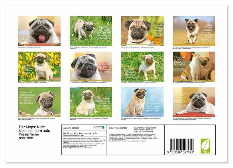 QUALITÄT - Hochwertiger Fotokalender mit 12 wunderschönen Motiven auf lichtbeständigem Bilderdruckpapier, robuste Spiralbindung mit Aufhängebügel.NACHHALTIG - deutliche Abfallreduzierung durch bedarfsgerechte Einzelstückfertigung, umweltfreundliches FSC-zertifiziertes Papier, Produktion in Deutschland, klimabewusste Logistik.PERFEKTES GESCHENK - Kalender für Freunde und Familie, für Kinder und Erwachsene, jung und alt, zu Weihnachten, Geburtstag oder zwischendurch.VIELFALT - Bildkalender in verschiedenen Formaten, z.B. DIN A5, DIN A4, DIN A3 sowie DIN A2. Ob Naturmotiv, Gemälde oder Fotos, ideal für ein persönliches Wohlfühlambiente.Heiter bis mopsig: ein Sprüchekalender gegen Perfektionismus und Selbstoptimierung von Autor(in): CALVENDO Verlag
