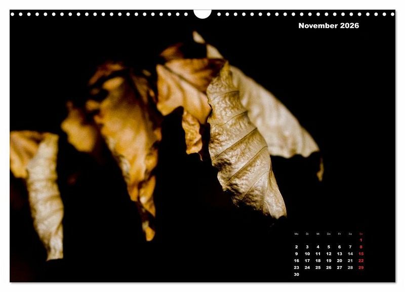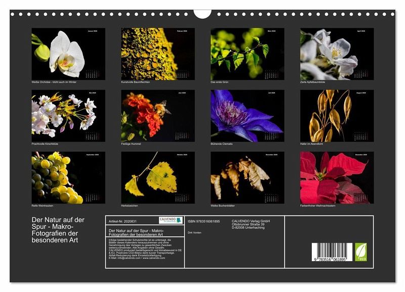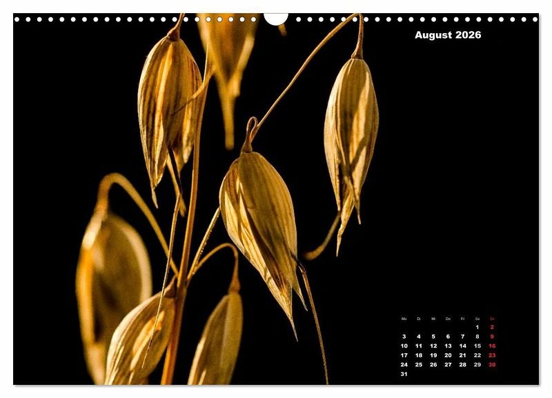 Der Kalender beinhaltet 12 außergewöhnliche Makro-Fotografien von atemberaubend schönen Blüten und Pflanzen passend zum jeweiligen Monat. Alle Motive wurden vor schwarzen Hintergründen fotografiert, durch diese Technik kommen die Farben und Details der Motive besonders exzellent zur Geltung.