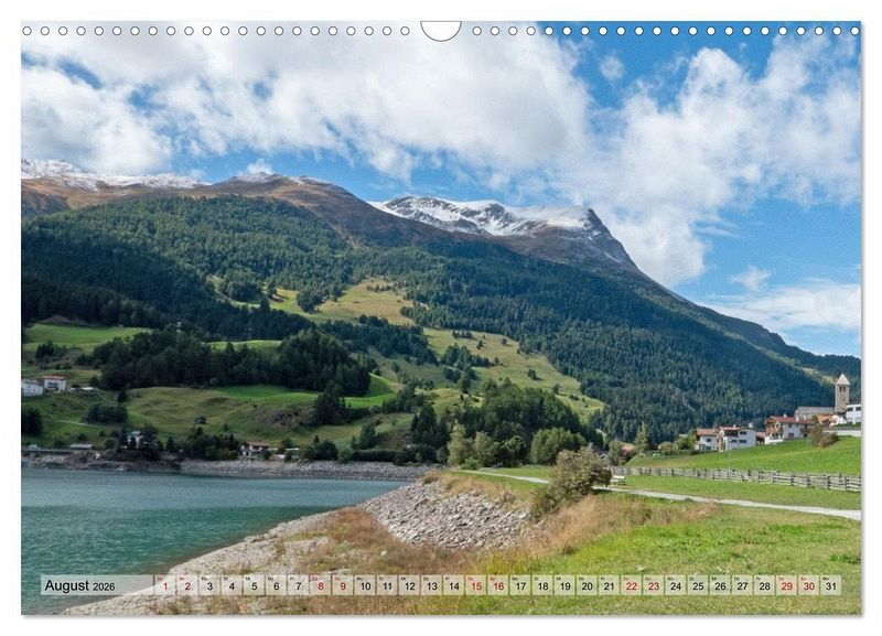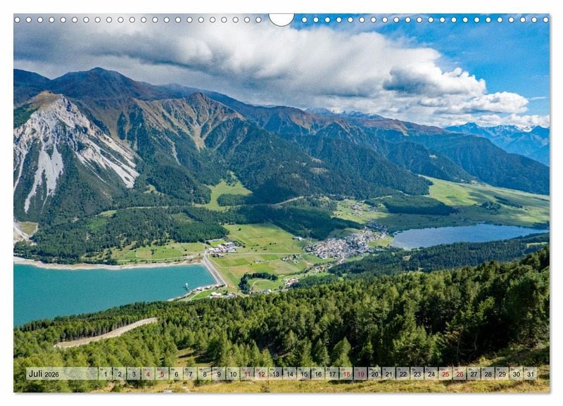 Juli: Blick vom Panoramasteig auf den Reschensee, St. Valentin und den Haidersee