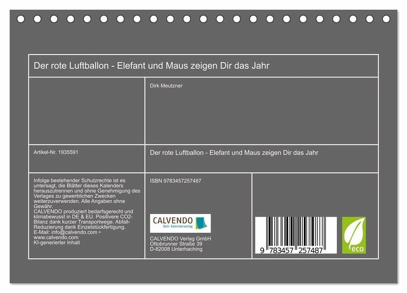 QUALITÄT - Hochwertiger Fotokalender mit 12 wunderschönen Motiven auf lichtbeständigem Bilderdruckpapier, robuste Spiralbindung.NACHHALTIG - deutliche Abfallreduzierung durch bedarfsgerechte Einzelstückfertigung, umweltfreundliches FSC-zertifiziertes Papier, Produktion in Deutschland, klimabewusste Logistik.PERFEKTES GESCHENK - Kalender für Freunde und Familie, für Kinder und Erwachsene, jung und alt, zu Weihnachten, Geburtstag oder zwischendurch.VIELFALT - Bildkalender in verschiedenen Formaten, z.B. DIN A5, DIN A4, DIN A3 sowie DIN A2. Ob Naturmotiv, Gemälde oder Fotos, ideal für ein persönliches Wohlfühlambiente.Magische Momente mit Elefant, Maus und Luftballon, dein zauberhafter Kalender für jeden Tag! von Autor(in): Dirk Meutzner