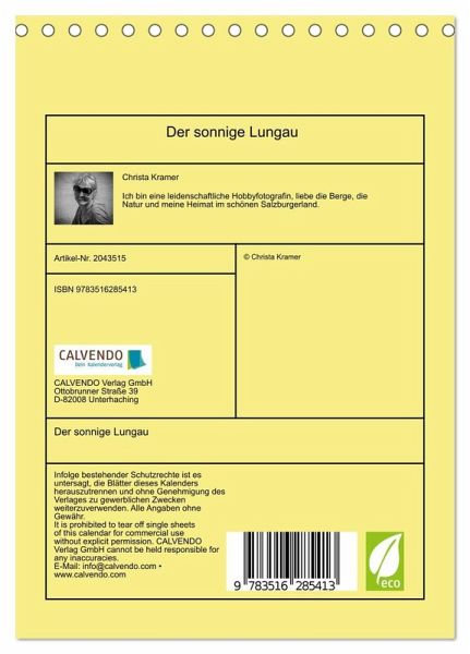 QUALITÄT - Hochwertiger Fotokalender mit 12 wunderschönen Motiven auf lichtbeständigem Bilderdruckpapier, robuste Spiralbindung.NACHHALTIG - deutliche Abfallreduzierung durch bedarfsgerechte Einzelstückfertigung, umweltfreundliches FSC-zertifiziertes Papier, Produktion in Deutschland, klimabewusste Logistik.PERFEKTES GESCHENK - Kalender für Freunde und Familie, für Kinder und Erwachsene, jung und alt, zu Weihnachten, Geburtstag oder zwischendurch.VIELFALT - Bildkalender in verschiedenen Formaten, z.B. DIN A5, DIN A4, DIN A3 sowie DIN A2. Ob Naturmotiv, Gemälde oder Fotos, ideal für ein persönliches Wohlfühlambiente.Die sonnigsten Plätze aus dem Lungau im schönen Salzburger Land von Autor(in): Christa Kramer