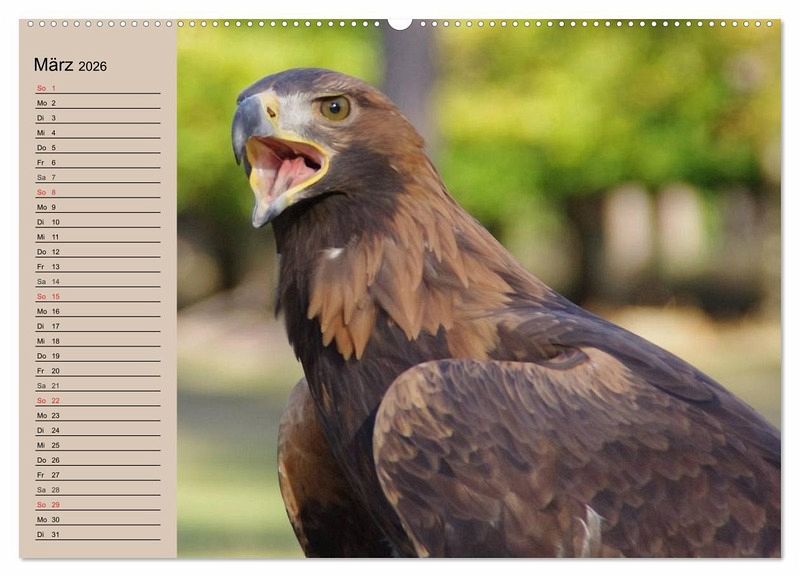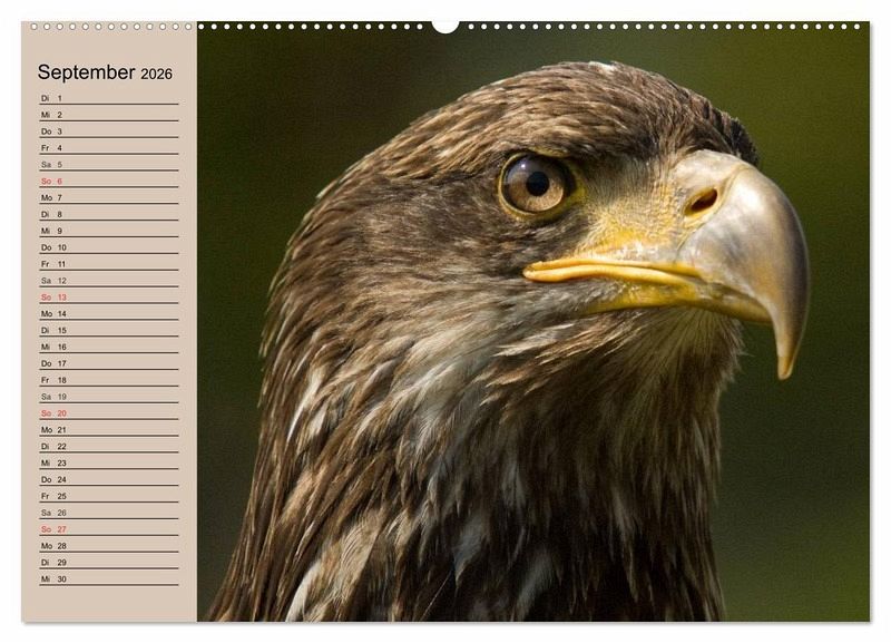 Der Steinadler ist nach dem Seeadler der größte in Deutschland beheimatete Greifvogel. Mit seiner Flügelspannweite von bis zu 230 cm ist er eine wirklich beeindruckende Erscheinung. Ein schöner Planer für alle Adler- und Greifvogel-Liebhaber.