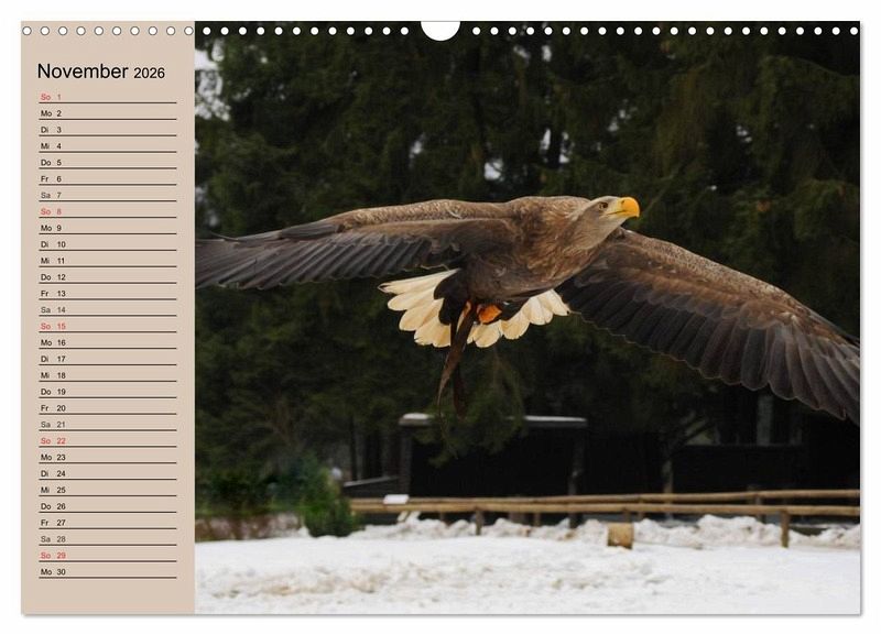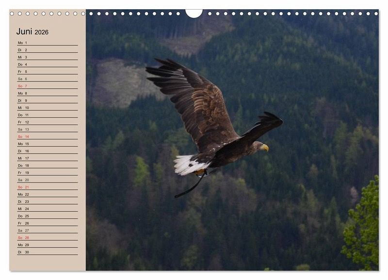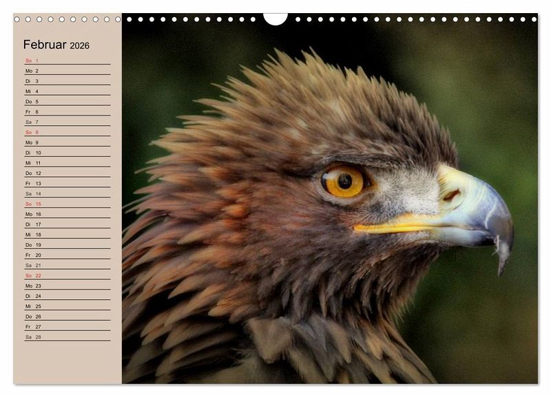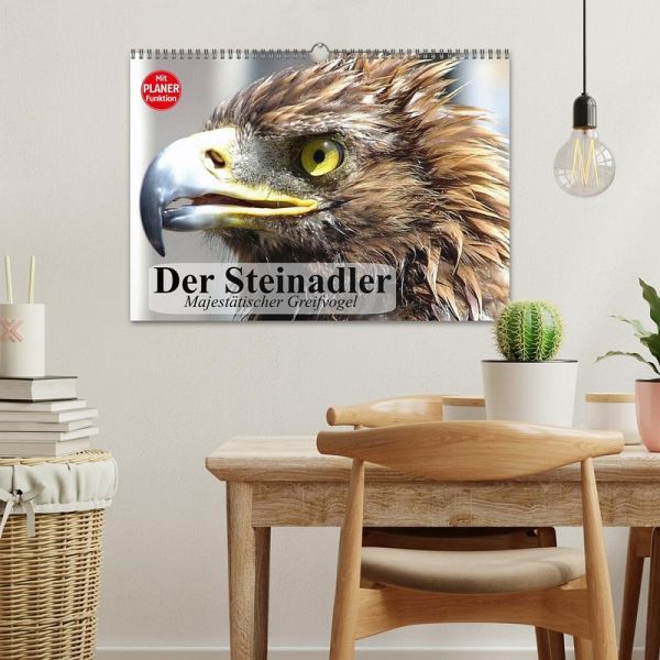 Der Steinadler ist nach dem Seeadler der größte in Deutschland beheimatete Greifvogel. Mit seiner Flügelspannweite von bis zu 230 cm ist er eine wirklich beeindruckende Erscheinung. Ein schöner Planer für alle Adler- und Greifvogel-Liebhaber.