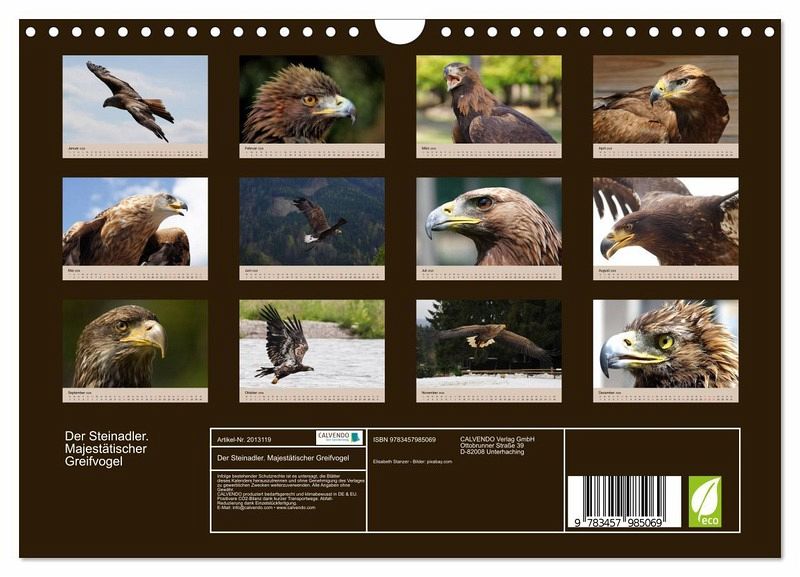 QUALITÄT - Hochwertiger Fotokalender mit 12 wunderschönen Motiven auf lichtbeständigem Bilderdruckpapier, robuste Spiralbindung mit Aufhängebügel.NACHHALTIG - deutliche Abfallreduzierung durch bedarfsgerechte Einzelstückfertigung, umweltfreundliches FSC-zertifiziertes Papier, Produktion in Deutschland, klimabewusste Logistik.PERFEKTES GESCHENK - Kalender für Freunde und Familie, für Kinder und Erwachsene, jung und alt, zu Weihnachten, Geburtstag oder zwischendurch.VIELFALT - Bildkalender in verschiedenen Formaten, z.B. DIN A5, DIN A4, DIN A3 sowie DIN A2. Ob Naturmotiv, Gemälde oder Fotos, ideal für ein persönliches Wohlfühlambiente.Der faszinierende und mächtige König der Lüfte von Autor(in): Elisabeth Stanzer