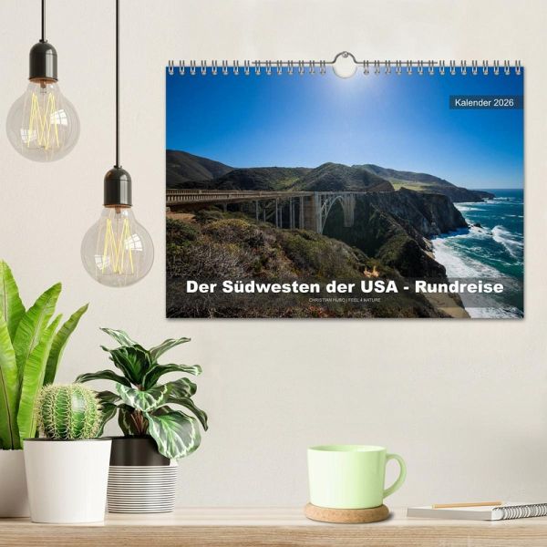 Endlose Weiten, farbenprächtige Canyons, wilde Küsten und fantastische Nationalparks - all das bietet der Südwesten der USA. Dieser Kalender nimmt Sie mit auf eine einzigartige Rundreise durch die schönsten Ecken dem amerikanischen Südwestens - vom Highway #1 und dem Joshua Tree NP an der Westküste der USA bis zum gigantischen Grand Canyon in Arizona und den unvergesslichen Zion Nationalpark in Utah.