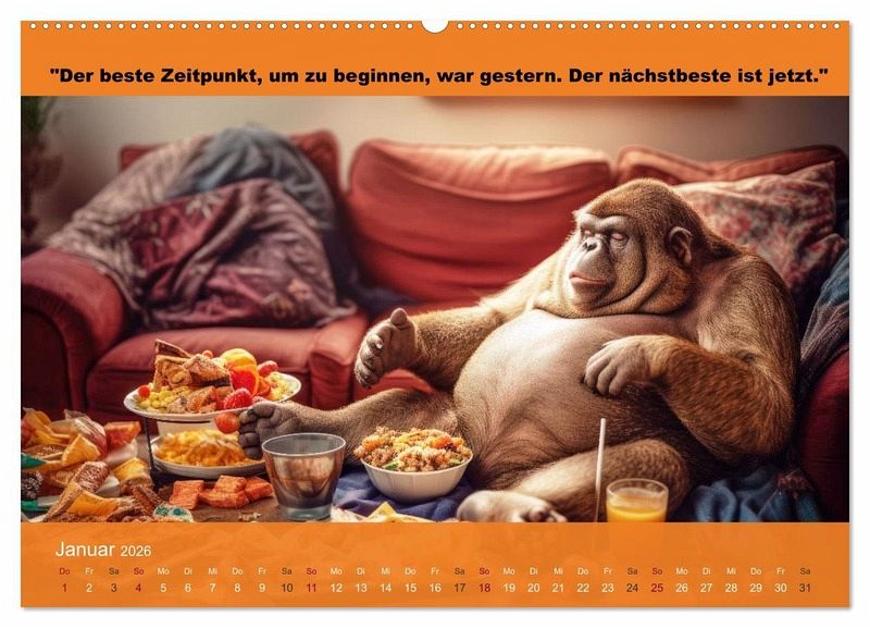 Entdecken Sie den ultimativen Motivationsboost für Ihr Abnehmziel. Unser einzigartiger Kalender begleitet Sie durch das Jahr mit einem Lächeln! Jeden Monat erwartet Sie ein humorvoller Spruch, gepaart mit einem unwiderstehlich lustigen Tierbild, das Sie inspiriert, Ihre Fitnessziele mit Freude anzugehen. Vergessen Sie langweilige Diätpläne und monotone Workouts. Mit unserem Kalender wird jede Gewichtsreduktion zur fröhlichen Herausforderung. Lassen Sie sich Monat für Monat motivieren, bleiben Sie dran an Ihren Zielen und genießen Sie den Weg zu einem gesünderen Ich. Mit unserem Kalender an Ihrer Seite wird jeder Tag zu einem Schritt voller Freude und Lachen auf Ihrer Reise zum Wunschgewicht. Holen Sie sich jetzt Ihren Begleiter für ein Jahr voller Motivation und Spaß!