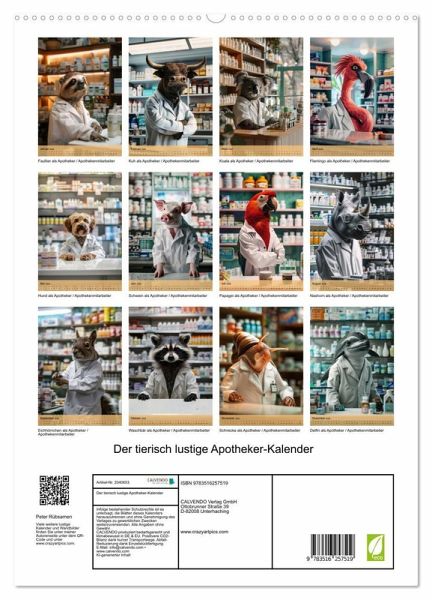 PREMIUM-LINIE - Brillanter Fotokalender mit 12 wunderschönen Motiven, Kunstdruck in Hochglanz in Museumsqualität.QUALITÄT - edle Materialien, stabile Rückwand mit 2 innovativen Einstecktaschen für eine optimale Präsentation an der Wand.NACHHALTIG - deutliche Abfallreduzierung durch bedarfsgerechte Einzelstückfertigung, umweltfreundliches FSC-zertifiziertes Papier, Produktion in Deutschland, klimabewusste Logistik.PERFEKTES GESCHENK - Kalender für Freunde und Familie, für Kinder und Erwachsene, jung und alt, zu Weihnachten, Geburtstag oder zwischendurch.Ein Muss für alle Apothekenmitarbeiter mit Verständnis für tierischen Humor von Autor(in): Peter Rübsamen