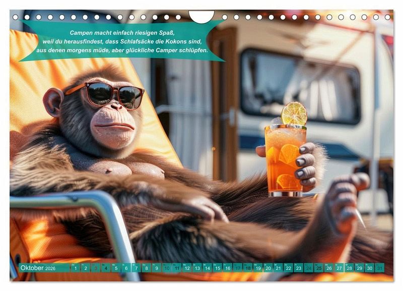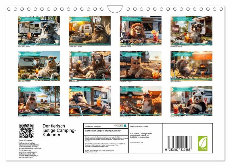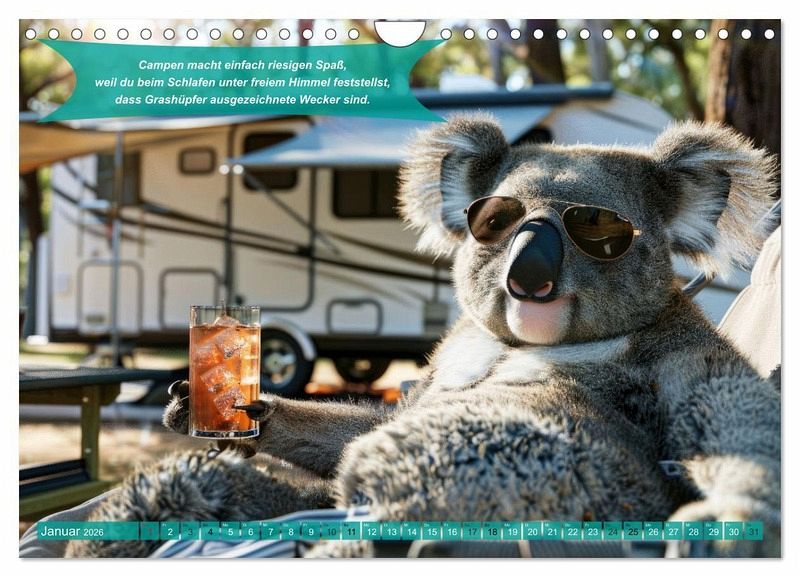 Entdecken Sie den ultimativen Begleiter für Ihr Camping-Abenteuer: "Der tierisch lustige Camping-Kalender". Mit diesem einzigartigen Jahreskalender wird jeder Tag im Freien zu einem unvergesslichen Erlebnis. Jeder Monat überrascht mit humorvollen Sprüchen und entzückenden KI generierten Bildern von Tieren, die das Camping-Leben in vollen Zügen genießen. Diese tierischen Camper bringen garantiert ein Lächeln auf Ihre Lippen. Perfekt für alle, die die Natur lieben und dabei gerne lachen, ist dieser Kalender das ideale Geschenk für Campingfans jeder Altersklasse. Ob als Geburtstagsgeschenk, Weihnachtsüberraschung oder einfach als kleine Aufmerksamkeit zwischendurch - "Der tierisch lustige Camping-Kalender" sorgt für Freude und Heiterkeit.
