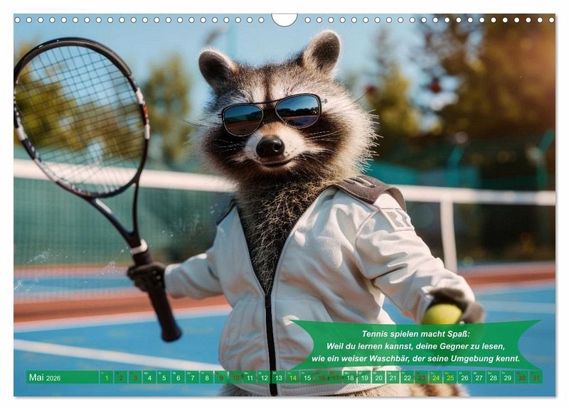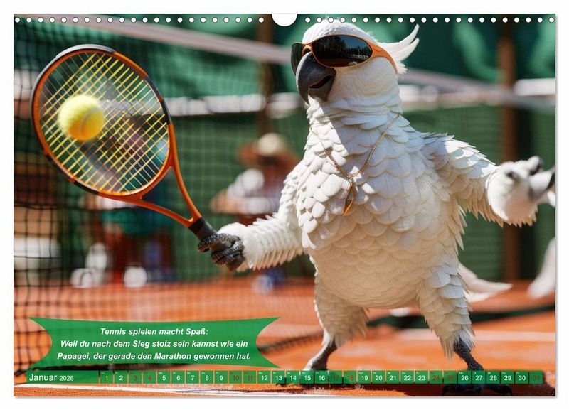Entdecken Sie den ultimativen Jahreskalender für Tennisliebhaber mit einer tierisch lustigen Wendung. Der "Tierisch Lustige Tennis-Kalender" ist Ihr täglicher Schlagabtausch voller Humor und Charme. Jeden Monat erwartet Sie ein einzigartiges mit KI erstelltes Bild von Tieren, die in voller Tennis-Montur den Schläger schwingen. Dieser Kalender bringt garantiert ein Lächeln auf die Lippen jedes Tennisfans. Jedes Bild wird von einem witzigen Spruch begleitet, der die Persönlichkeit unserer vierbeinigen Tennisstars perfekt einfängt. Ob es um den Ehrgeiz im Spiel geht oder um die lustigen Pannen auf dem Platz. Diese Sprüche machen den Kalender zu einem unvergesslichen Begleiter durch das Jahr für alle Tennisfreunde.