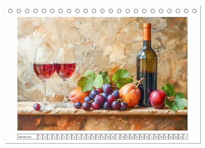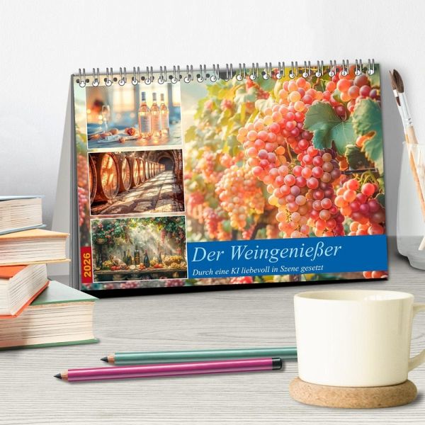 Erleben Sie die reiche Vielfalt der Weine - von den tiefroten Farben und betörenden Aromen bis hin zu den unvergesslichen Geschmackserlebnissen. Er nimmt Sie mit, auf eine Reise durch die Weinberge der Welt, lässt Sie die Geschichten hinter den edlen Tropfen entdecken und zeigt, wie Wein Menschen zusammenbringt und besondere Momente unvergesslich macht. Alle hier gezeigten Bilder wurden mit Sorgfalt, Liebe und mit Hilfe einer KI generiert. Abschließend werden sie mit Bildbearbeitungsprogrammen überarbeitet und in den Kalender eingefügt.