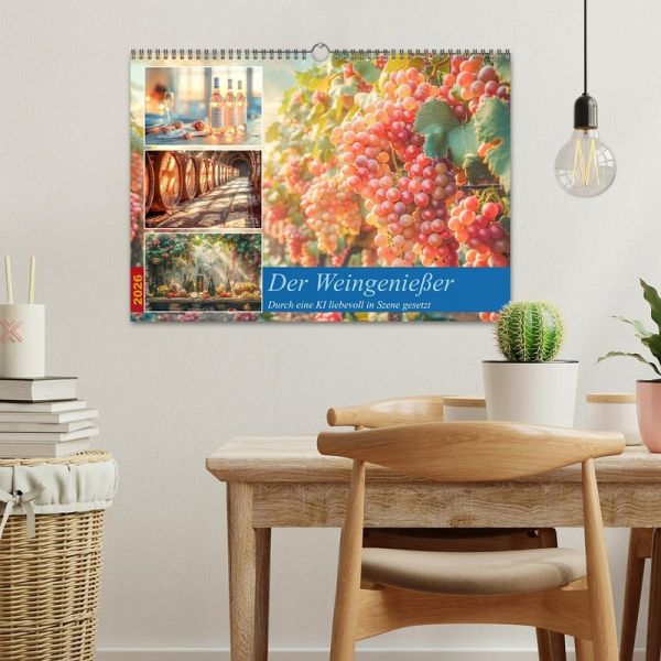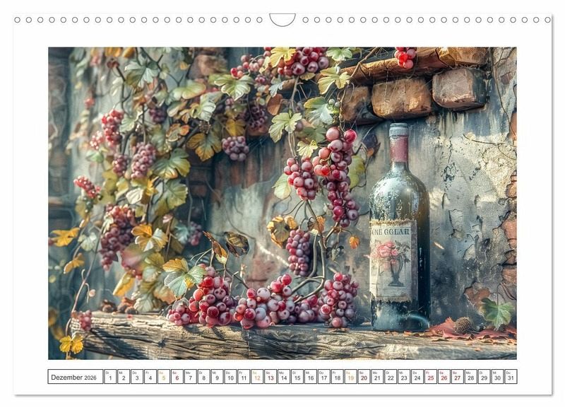 Erleben Sie die reiche Vielfalt der Weine - von den tiefroten Farben und betörenden Aromen bis hin zu den unvergesslichen Geschmackserlebnissen. Er nimmt Sie mit, auf eine Reise durch die Weinberge der Welt, lässt Sie die Geschichten hinter den edlen Tropfen entdecken und zeigt, wie Wein Menschen zusammenbringt und besondere Momente unvergesslich macht. Alle hier gezeigten Bilder wurden mit Sorgfalt, Liebe und mit Hilfe einer KI generiert. Abschließend werden sie mit Bildbearbeitungsprogrammen überarbeitet und in den Kalender eingefügt.
