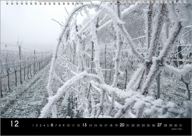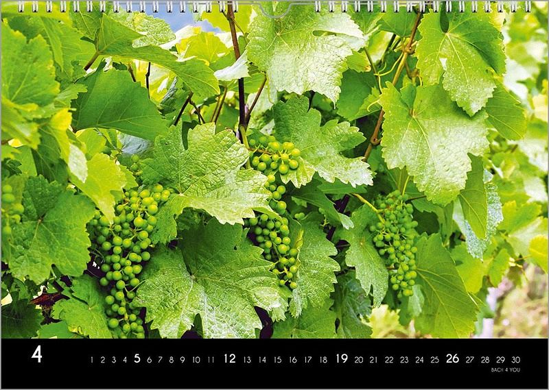 Der Weinkalender 2026 ist eine Kollektion von 12 hervorragend fotografierten Weinmotiven, die den Weinliebhaber durch das Jahr im Weinberg begleiten. Genau aus diesem Grund zieren alte Wein-Holzfässer und im Februar Weingläser die ersten beiden Monate im Jahr. Über die ersten zarten Knospen der Weintrauben führt das Kalenderjahr hin zum Sommer mit vollen reifen Trauben am Weinstock. Die Herbstmonate begleiten 2 herrliche Fotos von einem Weinberg im Herbst und einem bildfüllenden Weinblatt in buntem gelb, grün und rot vor einem blauen Himmel. Im November erreicht die Kalender-Saison mit einem modern fotografierten, gefüllten Rotwein-Glas ihren Höhepunkt. Der Dezember beschließt den Weinkalender schließlich mit einem Winterbild des Weinberges: Raureif überzieht die Reben an einem nebeligen, düsteren Tag. Das Kalendarium in diesem Weinkalender ist so gehalten, dass es in allen Sprachen funktioniert.