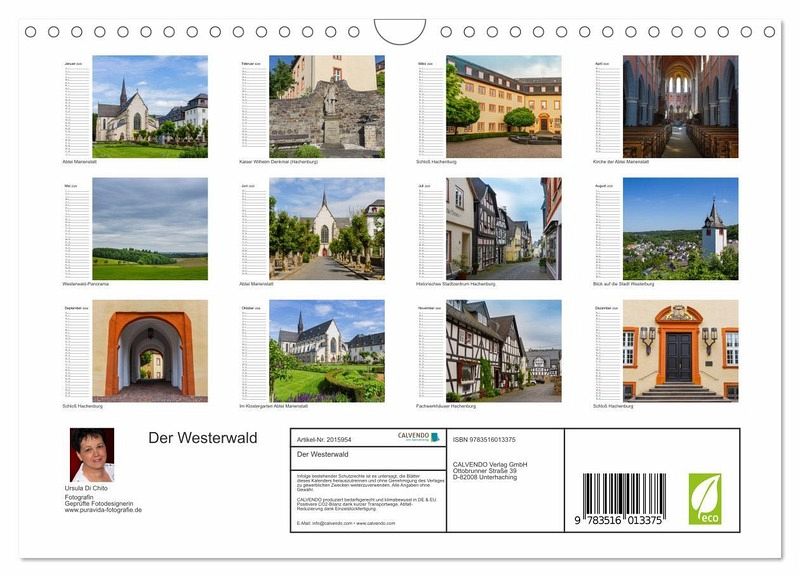 Oh du schöner Westerwald....... Dieser schöne Kalender zeigt Ihnen Impressionen der beeindruckenden Abtei Marienstatt, sowie der Städte Westerburg und Hachenburg. Im Westerwald findet man idyllische und beschauliche Städte mit beeindruckender Architektur sowie Natur pur in unmittelbarer Umgebung.