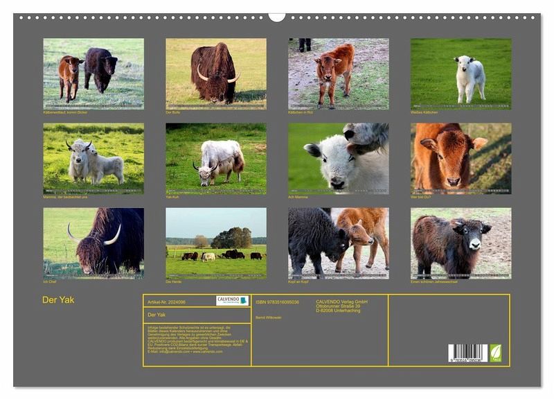 QUALITÄT - Hochwertiger Fotokalender mit 12 wunderschönen Motiven auf lichtbeständigem Bilderdruckpapier, robuste Spiralbindung mit Aufhängebügel.NACHHALTIG - deutliche Abfallreduzierung durch bedarfsgerechte Einzelstückfertigung, umweltfreundliches FSC-zertifiziertes Papier, Produktion in Deutschland, klimabewusste Logistik.PERFEKTES GESCHENK - Kalender für Freunde und Familie, für Kinder und Erwachsene, jung und alt, zu Weihnachten, Geburtstag oder zwischendurch.VIELFALT - Bildkalender in verschiedenen Formaten, z.B. DIN A5, DIN A4, DIN A3 sowie DIN A2. Ob Naturmotiv, Gemälde oder Fotos, ideal für ein persönliches Wohlfühlambiente.Yaks sind liebevolle, soziale Tiere, anders als unsere Hausrinder von Autor(in): Mico10
