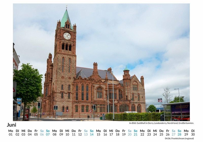 Entdecken Sie die faszinierende Stadt Derry in Nordirland mit unserem hochwertigen Wandkalender! Lassen Sie sich Monat für Monat von 12 atemberaubenden Motiven verzaubern, die die einzigartige Geschichte, Kultur und Landschaft dieser charmanten Stadt einfangen. Gedruckt auf lichtbeständigem Bilderdruckpapier, garantieren die brillanten Farben langanhaltende Freude. Unser Kalender wird in Deutschland auf FSC-zertifiziertem Papier produziert - für eine nachhaltige und umweltfreundliche Wahl. Perfekt als Geschenk oder für Ihr eigenes Zuhause, bringt dieser Kalender die Schönheit Derrys direkt an Ihre Wand. Sichern Sie sich jetzt Ihr Exemplar und erleben Sie Derry das ganze Jahr über! Hochwertig Erleben Sie ein Jahr voller Eleganz mit unserem Premium-Fotokalender. Jedes der 12 Motive ist auf hochwertigem, lichtbeständigem Bilderdruckpapier gedruckt, um die Lebendigkeit jedes Bildes zu bewahren. Die robuste Spiralbindung gewährleistet Langlebigkeit und einfache Handhabung. Nachhaltig Unser Engagement für die Umwelt spiegelt sich in jedem Exemplar wider. Durch die Produktion auf Abruf reduzieren wir signifikant unseren Abfall. Wir verwenden ausschließlich umweltfreundliches, FSC-zertifiziertes Papier. Stolz gefertigt in Deutschland, achten wir bei unserer Logistik auf Klimaschutz, um unseren ökologischen Fußabdruck zu minimieren. Das ideale Geschenk Dieser Kalender ist das perfekte Präsent für jeden Anlass - ob Weihnachten, Geburtstage oder einfach als liebevolle Aufmerksamkeit zwischendurch. Geeignet für Freunde, Familie, Kinder und Erwachsene gleichermaßen, bereichert er jedes Zuhause mit seiner Vielfalt und Schönheit, unabhängig vom Alter der Beschenkten.