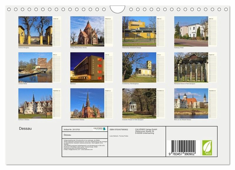 Dessau war jahrhundertelang die Residenz des Fürsten- und Herzogtums Anhalt. Es entstanden sehenswerte Bauwerke und eine bezaubernde Garten- und Parklandschaft. Ebenso weltberühmt ist Dessau als "Bauhaus"-Stadt mit seiner einzigartigen Architektur. Tragen sie ihre Termine, Geburtstage bequem in diesen Planer ein.