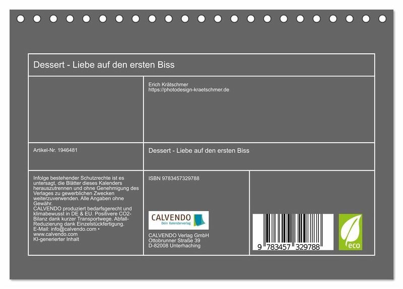 QUALITÄT - Hochwertiger Fotokalender mit 12 wunderschönen Motiven auf lichtbeständigem Bilderdruckpapier, robuste Spiralbindung.NACHHALTIG - deutliche Abfallreduzierung durch bedarfsgerechte Einzelstückfertigung, umweltfreundliches FSC-zertifiziertes Papier, Produktion in Deutschland, klimabewusste Logistik.PERFEKTES GESCHENK - Kalender für Freunde und Familie, für Kinder und Erwachsene, jung und alt, zu Weihnachten, Geburtstag oder zwischendurch.VIELFALT - Bildkalender in verschiedenen Formaten, z.B. DIN A5, DIN A4, DIN A3 sowie DIN A2. Ob Naturmotiv, Gemälde oder Fotos, ideal für ein persönliches Wohlfühlambiente.Verführerische Desserts, kunstvoll angerichtet und fein veredelt von Autor(in): Marion G. Krätschmer