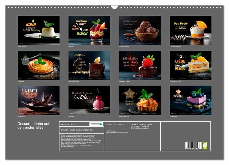 QUALITÄT - Hochwertiger Fotokalender mit 12 wunderschönen Motiven auf lichtbeständigem Bilderdruckpapier, robuste Spiralbindung mit Aufhängebügel.NACHHALTIG - deutliche Abfallreduzierung durch bedarfsgerechte Einzelstückfertigung, umweltfreundliches FSC-zertifiziertes Papier, Produktion in Deutschland, klimabewusste Logistik.PERFEKTES GESCHENK - Kalender für Freunde und Familie, für Kinder und Erwachsene, jung und alt, zu Weihnachten, Geburtstag oder zwischendurch.VIELFALT - Bildkalender in verschiedenen Formaten, z.B. DIN A5, DIN A4, DIN A3 sowie DIN A2. Ob Naturmotiv, Gemälde oder Fotos, ideal für ein persönliches Wohlfühlambiente.Verführerische Desserts, kunstvoll angerichtet und fein veredelt von Autor(in): Marion G. Krätschmer