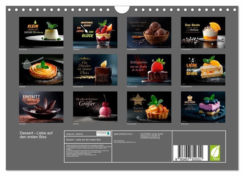 QUALITÄT - Hochwertiger Fotokalender mit 12 wunderschönen Motiven auf lichtbeständigem Bilderdruckpapier, robuste Spiralbindung mit Aufhängebügel.NACHHALTIG - deutliche Abfallreduzierung durch bedarfsgerechte Einzelstückfertigung, umweltfreundliches FSC-zertifiziertes Papier, Produktion in Deutschland, klimabewusste Logistik.PERFEKTES GESCHENK - Kalender für Freunde und Familie, für Kinder und Erwachsene, jung und alt, zu Weihnachten, Geburtstag oder zwischendurch.VIELFALT - Bildkalender in verschiedenen Formaten, z.B. DIN A5, DIN A4, DIN A3 sowie DIN A2. Ob Naturmotiv, Gemälde oder Fotos, ideal für ein persönliches Wohlfühlambiente.Verführerische Desserts, kunstvoll angerichtet und fein veredelt von Autor(in): Marion G. Krätschmer