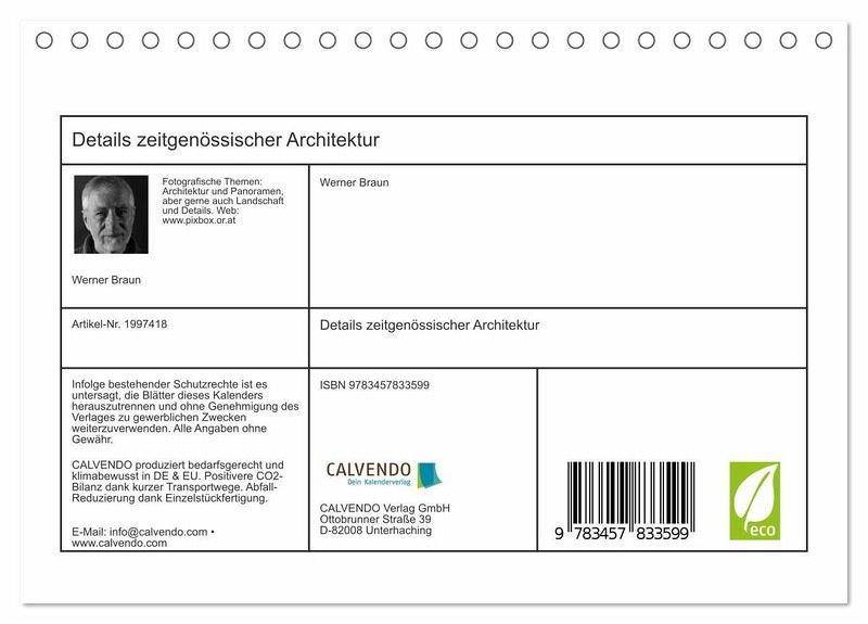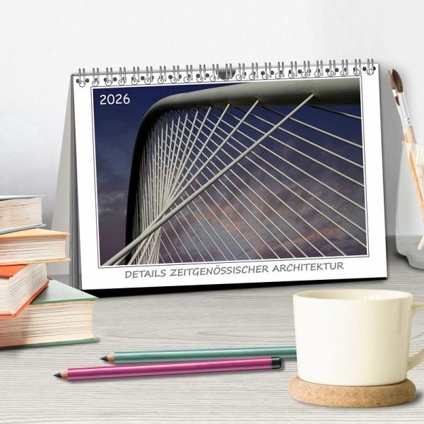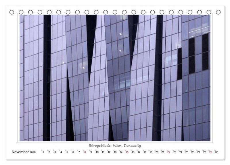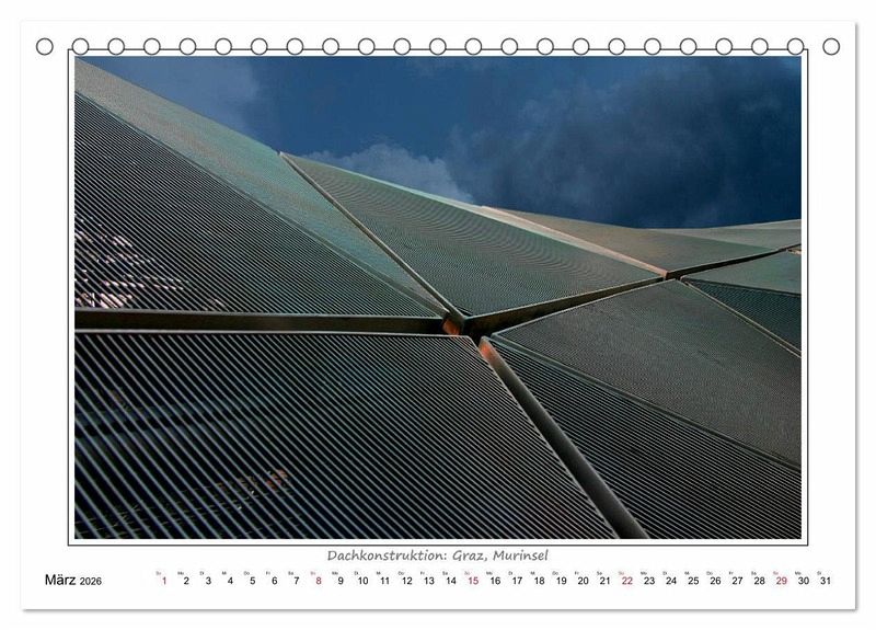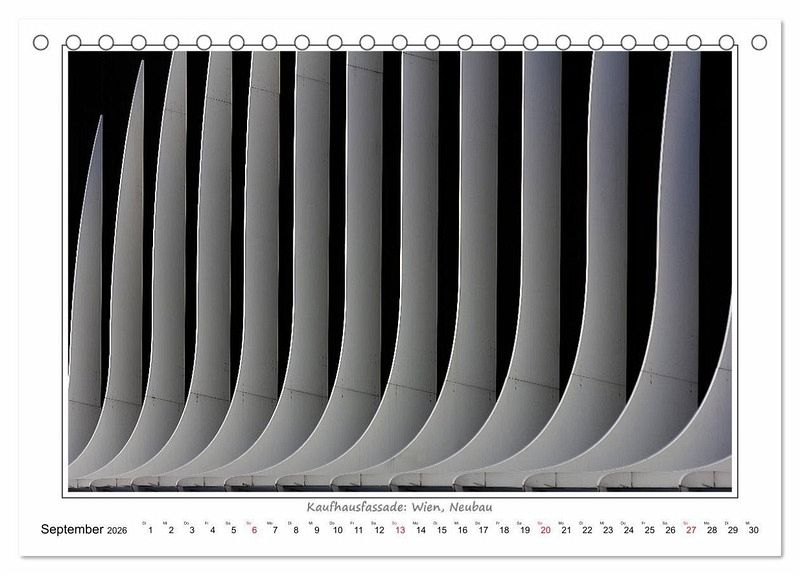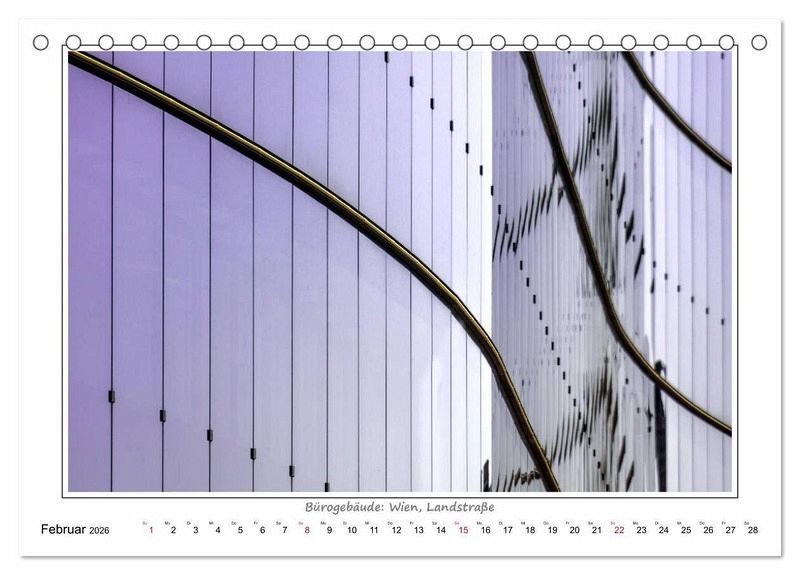Die Kalenderbilder zeigen Details zeitgenössischer Baukunst. Ein Aspekt dabei ist der Rhythmus, die Wiederkehr sich gleichender Formen. Lebendig wird dieser Rhythmus erst durch die Variation: in der Linienführung, in der Krümmung, in der Größe bestimmter Elemente und in anderen gestalterischen Details, welche Ähnlichkeit zulassen, aber keine absolute Gleichheit in den Wiederholungen.