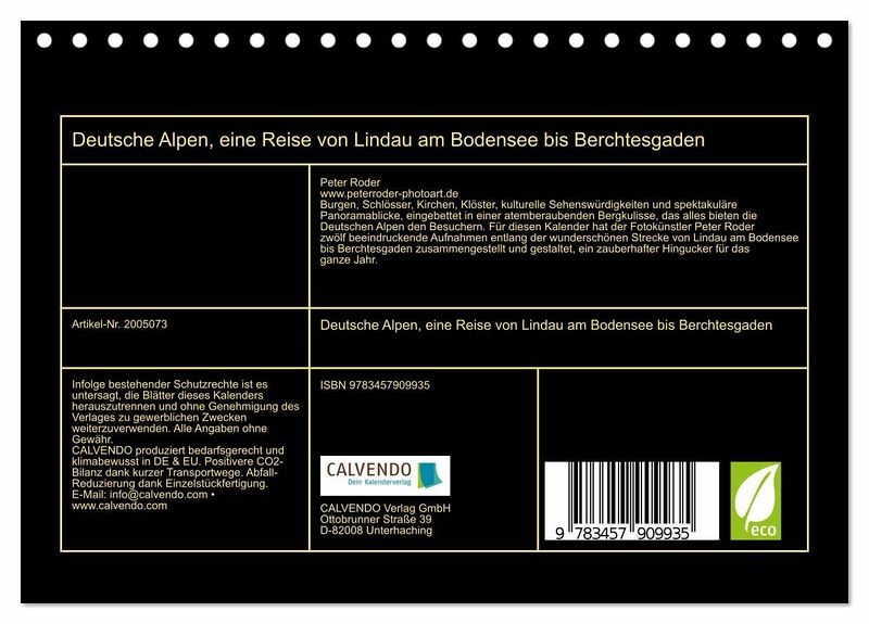 Burgen, Schlösser, Kirchen, Klöster, kulturelle Sehenswürdigkeiten und spektakuläre Panoramablicke, eingebettet in einer atemberaubenden Bergkulisse, das alles bieten die Deutschen Alpen den Besuchern. Für diesen Kalender hat der Fotokünstler Peter Roder zwölf beeindruckende Aufnahmen entlang der wunderschönen Strecke von Lindau am Bodensee bis Berchtesgaden zusammengestellt und gestaltet, ein zauberhafter Hingucker für das ganze Jahr.