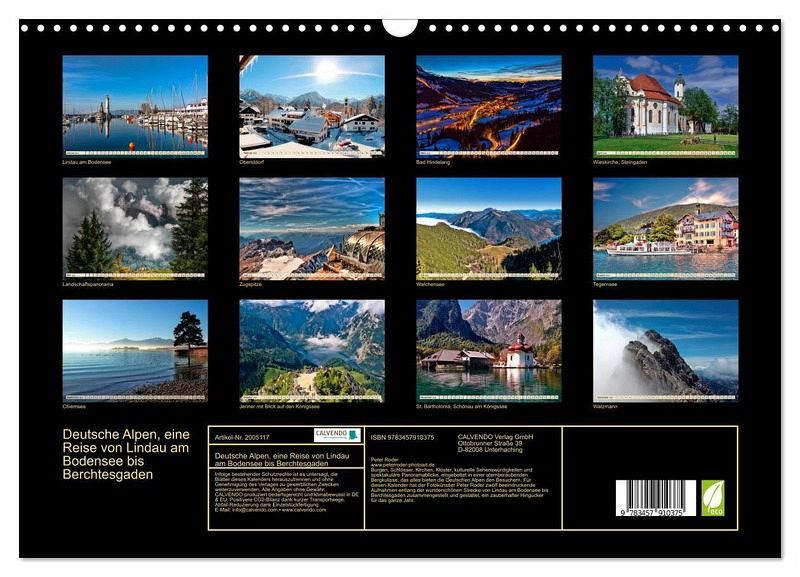 Burgen, Schlösser, Kirchen, Klöster, kulturelle Sehenswürdigkeiten und spektakuläre Panoramablicke, eingebettet in einer atemberaubenden Bergkulisse, das alles bieten die Deutschen Alpen den Besuchern. Für diesen Kalender hat der Fotokünstler Peter Roder zwölf beeindruckende Aufnahmen entlang der wunderschönen Strecke von Lindau am Bodensee bis Berchtesgaden zusammengestellt und gestaltet, ein zauberhafter Hingucker für das ganze Jahr.