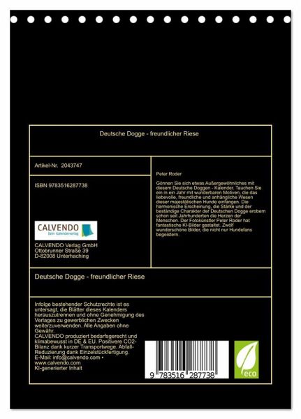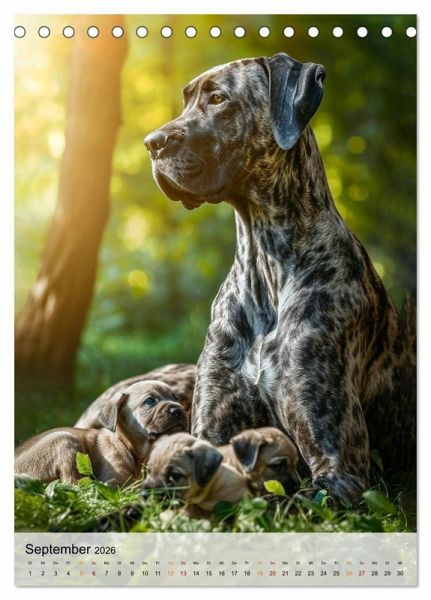 Gönnen Sie sich etwas Außergewöhnliches mit diesem Deutsche Doggen - Kalender. Tauchen Sie ein in ein Jahr mit wunderbaren Motiven, die das liebevolle, freundliche und anhängliche Wesen dieser majestätischen Hunde einfangen. Die harmonische Erscheinung, die Stärke und der beständige Charakter der Deutschen Dogge erobern schon seit Jahrhunderten die Herzen der Menschen. Der Fotokünstler Peter Roder hat fantastische KI-Bilder gestaltet. Zwölf wunderschöne Bilder, die nicht nur Hundefans begeistern.