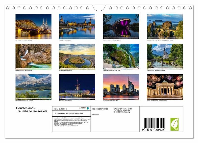 QUALITÄT - Hochwertiger Fotokalender mit 12 wunderschönen Motiven auf lichtbeständigem Bilderdruckpapier, robuste Spiralbindung mit Aufhängebügel.NACHHALTIG - deutliche Abfallreduzierung durch bedarfsgerechte Einzelstückfertigung, umweltfreundliches FSC-zertifiziertes Papier, Produktion in Deutschland, klimabewusste Logistik.PERFEKTES GESCHENK - Kalender für Freunde und Familie, für Kinder und Erwachsene, jung und alt, zu Weihnachten, Geburtstag oder zwischendurch.VIELFALT - Bildkalender in verschiedenen Formaten, z.B. DIN A5, DIN A4, DIN A3 sowie DIN A2. Ob Naturmotiv, Gemälde oder Fotos, ideal für ein persönliches Wohlfühlambiente.Viele wunderschöne Reiseziele von Deutschland perfekt fotografiert. von Autor(in): Uwe Herzog
