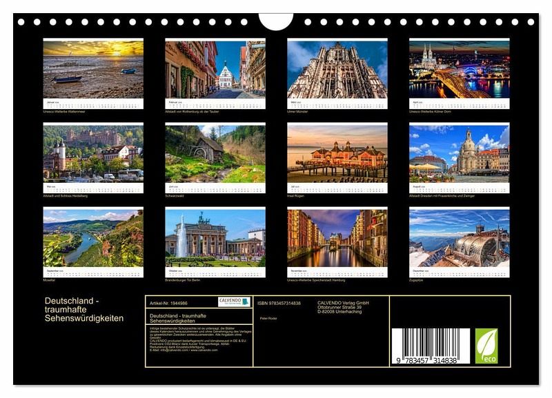 Entdecken Sie Deutschland mit diesem Kalender. Tauchen Sie jeden Monat in die Schönheit dieses vielfältigen Landes ein. Erkunden Sie altehrwürdige Städte, die reich an Geschichte und Kultur sind und in denen jeder Winkel eine Geschichte erzählt oder begeben Sie sich auf große Fahrt vom Wattenmeer bis an die Zugspitze. Der Fotokünstler Peter Roder hat fabelhafte Bilder gestaltet und zusammengestellt. Perfekt für alle, die gerne auf Entdeckungsreise gehen oder davon träumen, Deutschland zu besuchen.