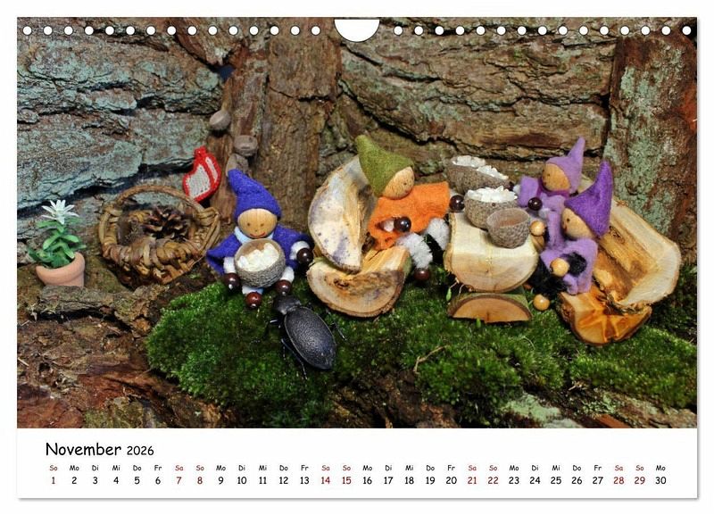 November: Vier kleine Wichtel essen Reis in ihrer Wichtelhöhle