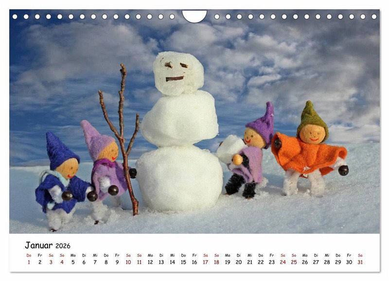 Januar: Vier kleine Wichtel bauen einen Schneemann