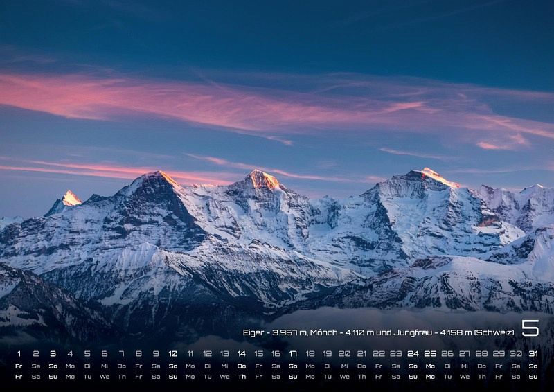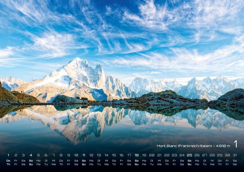 Über den Wolken, muss die Freiheit wohl grenzenlos sein... - Kommt mit auf einer Reise von der Zugspitze in Deutschland über den Großglockner in Österreich, den Triglav in Slowenien, die Drei Zinnen in Südtirol, das Matterhorn in der Schweiz bis zum Mont Blanc in Frankreich! Mit unserem liebevoll gestalteten Kalender sämtlicher Regionen der Alpen. Lass dich von 14 hochwertigen Aufnahmen dieser wundervollen Landschaft begeistern. Seid gespannt und sichert euch euer Exemplar im Format DIN A3, DIN A2 (extragroß) für das Jahr 2026!