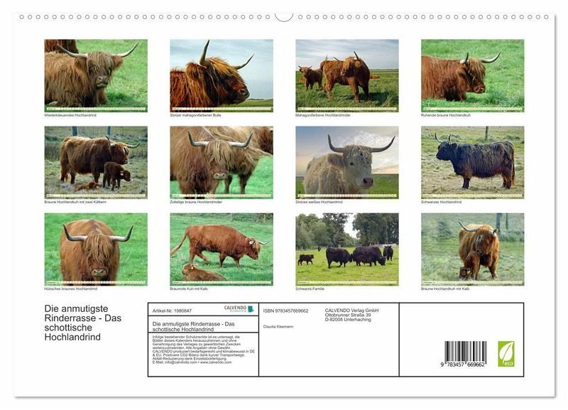 PREMIUM-LINIE - Brillanter Fotokalender mit 12 wunderschönen Motiven, Kunstdruck in Hochglanz in Museumsqualität.QUALITÄT - edle Materialien, stabile Rückwand mit 2 innovativen Einstecktaschen für eine optimale Präsentation an der Wand.NACHHALTIG - deutliche Abfallreduzierung durch bedarfsgerechte Einzelstückfertigung, umweltfreundliches FSC-zertifiziertes Papier, Produktion in Deutschland, klimabewusste Logistik.PERFEKTES GESCHENK - Kalender für Freunde und Familie, für Kinder und Erwachsene, jung und alt, zu Weihnachten, Geburtstag oder zwischendurch.Die schottischen Hochlandrinder mit ihrem zotteligen Fell ziehen jeden Betrachter in ihren Bann. von Autor(in): Claudia Kleemann