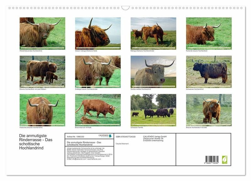 QUALITÄT - Hochwertiger Fotokalender mit 12 wunderschönen Motiven auf lichtbeständigem Bilderdruckpapier, robuste Spiralbindung mit Aufhängebügel.NACHHALTIG - deutliche Abfallreduzierung durch bedarfsgerechte Einzelstückfertigung, umweltfreundliches FSC-zertifiziertes Papier, Produktion in Deutschland, klimabewusste Logistik.PERFEKTES GESCHENK - Kalender für Freunde und Familie, für Kinder und Erwachsene, jung und alt, zu Weihnachten, Geburtstag oder zwischendurch.VIELFALT - Bildkalender in verschiedenen Formaten, z.B. DIN A5, DIN A4, DIN A3 sowie DIN A2. Ob Naturmotiv, Gemälde oder Fotos, ideal für ein persönliches Wohlfühlambiente.Die schottischen Hochlandrinder mit ihrem zotteligen Fell ziehen jeden Betrachter in ihren Bann. von Autor(in): Claudia Kleemann