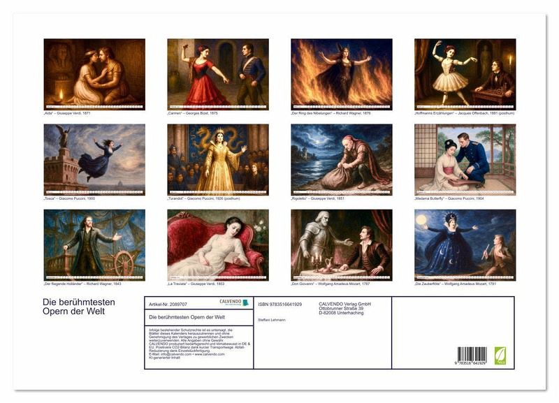 Tauchen Sie ein in die faszinierende Welt der Oper: Zwölf Meisterwerke der Musikgeschichte erwachen in eindrucksvollen, malerisch gestalteten Szenen, die Steffani Lehmann mit Unterstützung einer KI editiert hat, zu neuem Leben. Dieser Opernkalender ist ein Fest für Augen und Seele.