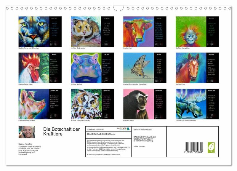 QUALITÄT - Hochwertiger Fotokalender mit 12 wunderschönen Motiven auf lichtbeständigem Bilderdruckpapier, robuste Spiralbindung mit Aufhängebügel.NACHHALTIG - deutliche Abfallreduzierung durch bedarfsgerechte Einzelstückfertigung, umweltfreundliches FSC-zertifiziertes Papier, Produktion in Deutschland, klimabewusste Logistik.PERFEKTES GESCHENK - Kalender für Freunde und Familie, für Kinder und Erwachsene, jung und alt, zu Weihnachten, Geburtstag oder zwischendurch.VIELFALT - Bildkalender in verschiedenen Formaten, z.B. DIN A5, DIN A4, DIN A3 sowie DIN A2. Ob Naturmotiv, Gemälde oder Fotos, ideal für ein persönliches Wohlfühlambiente.Liebevoll gemalte Krafttier Porträts der Künstlerin Sabine Koschier von Autor(in): Sabine Koschier