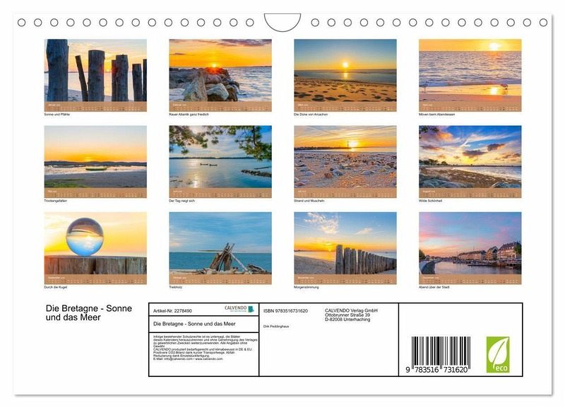 QUALITÄT - Hochwertiger Fotokalender mit 12 wunderschönen Motiven auf lichtbeständigem Bilderdruckpapier, robuste Spiralbindung mit Aufhängebügel.NACHHALTIG - deutliche Abfallreduzierung durch bedarfsgerechte Einzelstückfertigung, umweltfreundliches FSC-zertifiziertes Papier, Produktion in Deutschland, klimabewusste Logistik.PERFEKTES GESCHENK - Kalender für Freunde und Familie, für Kinder und Erwachsene, jung und alt, zu Weihnachten, Geburtstag oder zwischendurch.VIELFALT - Bildkalender in verschiedenen Formaten, z.B. DIN A5, DIN A4, DIN A3 sowie DIN A2. Ob Naturmotiv, Gemälde oder Fotos, ideal für ein persönliches Wohlfühlambiente.Die Bretagne am Atlantik - Sonne und Meer zeichnen stimmungsvolle Bilder von Autor(in): Dirk Peddinghaus