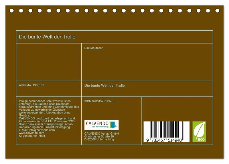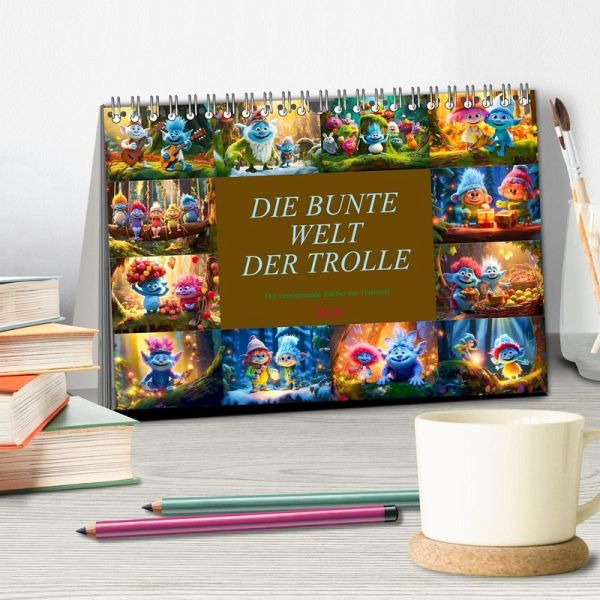 Entdecken Sie die faszinierende Welt der Trolle mit unserem bunten Wandkalender! Tauchen Sie ein in eine fantastische und farbenfrohe Welt voller Zauber und Abenteuer. Jeden Monat entführt Sie der Kalender in eine neue trollige Szene, die Ihnen ein Lächeln ins Gesicht zaubern wird.Ob als Geschenk für einen Troll-Liebhaber oder als besonderes Mitbringsel für Freunde und Familie, unser Wandkalender ist ein echter Hingucker. Die liebevoll gestalteten Illustrationen lassen die Trolle lebendig werden und sorgen für gute Laune das ganze Jahr über.Der Kalender bietet nicht nur einen praktischen Überblick über die Tage, sondern lädt auch zum Träumen ein. Lassen Sie sich von den bunten Trollen inspirieren und freuen Sie sich auf jeden Monat mit einem neuen kunterbunten Motiv. Erstellt wurde er mit Ki und Photoshop durch den Künstler Dirk Meutzner.Unser Wandkalender "Die bunte Welt der Trolle" ist hochwertig verarbeitet und wird sicherlich zum Blickfang in jedem Raum. Verschenken Sie ein Stück Magie und begeistern Sie Ihre Liebsten mit diesem originellen Geschenk.Sichern Sie sich jetzt unseren Wandkalender und erleben Sie die bunte Welt der Trolle jeden Tag aufs Neue!