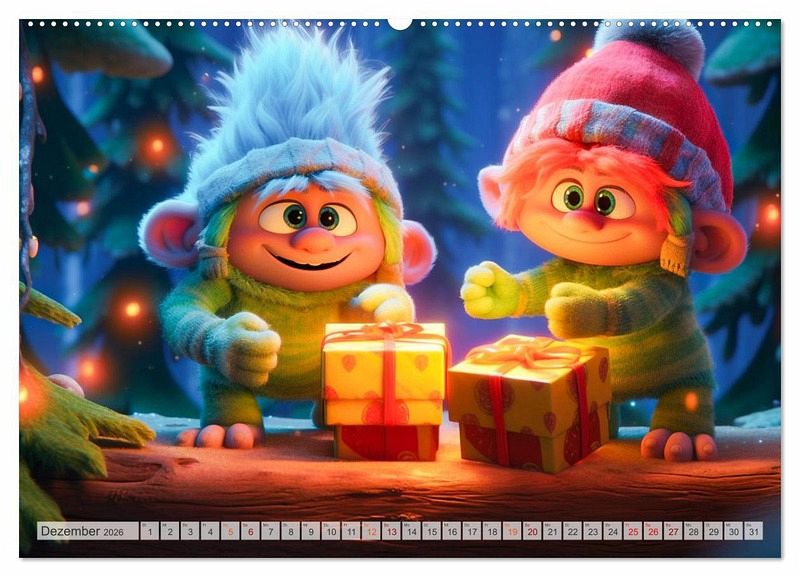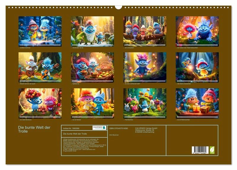 Entdecken Sie die faszinierende Welt der Trolle mit unserem bunten Wandkalender! Tauchen Sie ein in eine fantastische und farbenfrohe Welt voller Zauber und Abenteuer. Jeden Monat entführt Sie der Kalender in eine neue trollige Szene, die Ihnen ein Lächeln ins Gesicht zaubern wird.Ob als Geschenk für einen Troll-Liebhaber oder als besonderes Mitbringsel für Freunde und Familie, unser Wandkalender ist ein echter Hingucker. Die liebevoll gestalteten Illustrationen lassen die Trolle lebendig werden und sorgen für gute Laune das ganze Jahr über.Der Kalender bietet nicht nur einen praktischen Überblick über die Tage, sondern lädt auch zum Träumen ein. Lassen Sie sich von den bunten Trollen inspirieren und freuen Sie sich auf jeden Monat mit einem neuen kunterbunten Motiv. Erstellt wurde er mit Ki und Photoshop durch den Künstler Dirk Meutzner.Unser Wandkalender "Die bunte Welt der Trolle" ist hochwertig verarbeitet und wird sicherlich zum Blickfang in jedem Raum. Verschenken Sie ein Stück Magie und begeistern Sie Ihre Liebsten mit diesem originellen Geschenk.Sichern Sie sich jetzt unseren Wandkalender und erleben Sie die bunte Welt der Trolle jeden Tag aufs Neue!