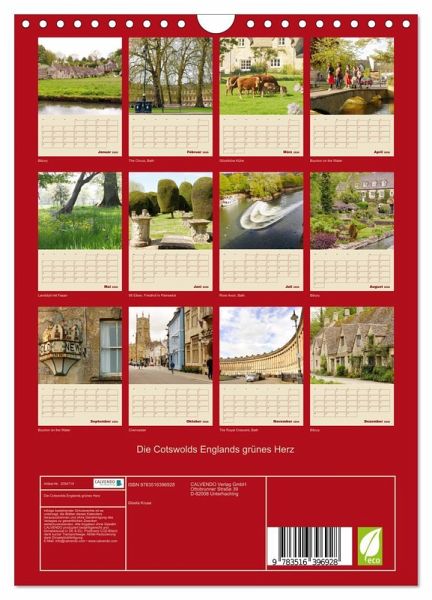 Die Cotswolds sind ein Magnet für Besucher aus aller Welt. Die Region hat viel zu bieten: Historische Marktstädtchen, prächtige Schlösser, pittoreske Dörfer mit honigfarbenen Sandsteinhäusern und eine sanfte, grüne Hügellandschaft. Und nicht zu vergessen: Bath, am südlichen Ende der Cotswolds. Die Stadt gehört zum Welterbe und ist auf jeden Fall einen Besuch wert. Genießen Sie diesen Kalender mit seinen einladenden Fotografien.