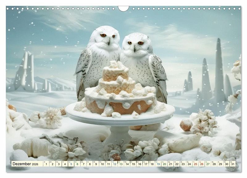 Dezember: Schneeeulen bei der Torte in herrlicher Winterlandschaft