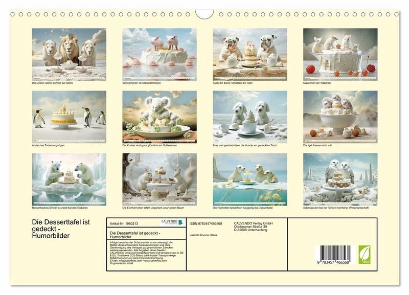 Natürlich ist das süße Naschen nichts für unsere tierischen Mitbewohner auf diesem Planeten, aber Gedanken und Fantasie sind frei. Mit einem Augenzwinkern werden humorvolle Bilder von Tieren, umgeben von köstlichen Leckereien, präsentiert. Ob kunstvoll dekorierte Eistorte, viel Sahne, oder verlockender Kuchen, die Tiere freut es. Eine wunderbare Möglichkeit, das Jahr mit einem Lächeln zu beginnen. Lassen Sie sich von den charmanten Motiven verzaubern und genießen Sie jeden Monat eine neue Überraschung. Diese lustige Idee wurde mit Hilfe der KI umgesetzt.