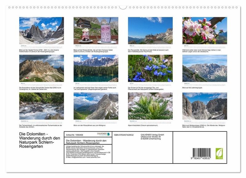 PREMIUM-LINIE - Brillanter Fotokalender mit 12 wunderschönen Motiven, Kunstdruck in Hochglanz in Museumsqualität.QUALITÄT - edle Materialien, stabile Rückwand mit 2 innovativen Einstecktaschen für eine optimale Präsentation an der Wand.NACHHALTIG - deutliche Abfallreduzierung durch bedarfsgerechte Einzelstückfertigung, umweltfreundliches FSC-zertifiziertes Papier, Produktion in Deutschland, klimabewusste Logistik.PERFEKTES GESCHENK - Kalender für Freunde und Familie, für Kinder und Erwachsene, jung und alt, zu Weihnachten, Geburtstag oder zwischendurch.Entdecken Sie mit diesem Kalender den einzigartigen Naturpark Schlern-Rosengarten, ein Wanderparadies inmitten der Südtiroler Dolomiten. von Autor(in): Birgit Matejka
