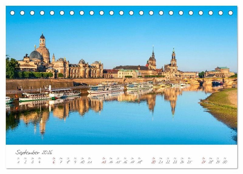 September: Dresden mit Kunstakademie, Frauenkirche, Hofkirche und Residenzschloss an der Elbe