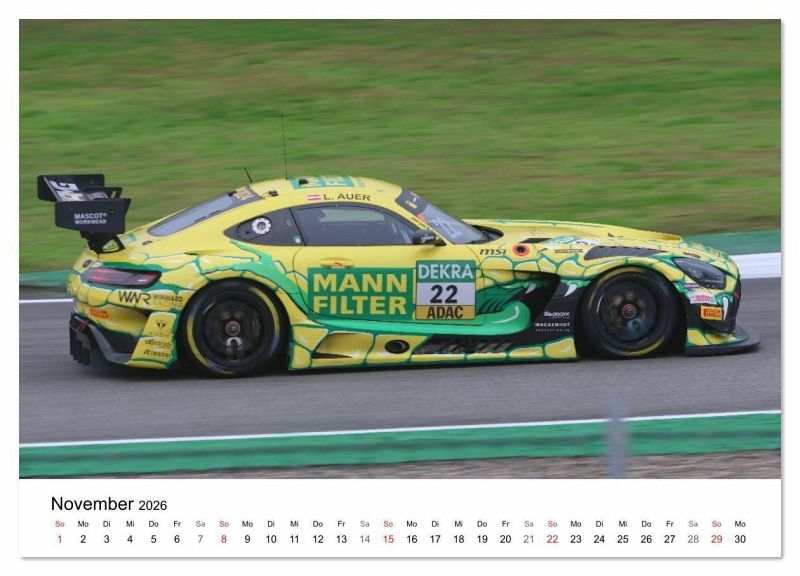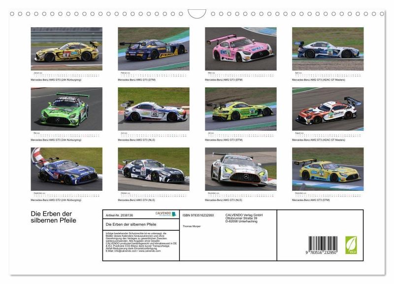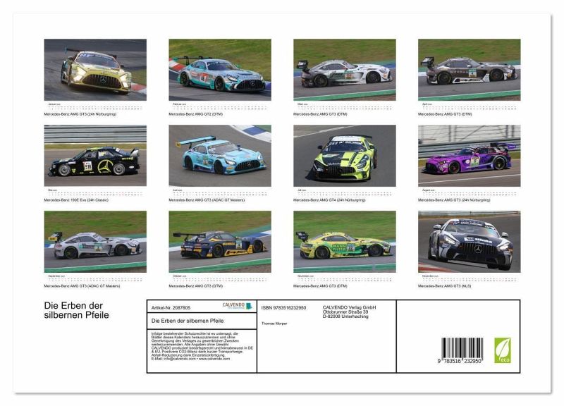 Mercedes-Benz steht mit den Silberpfeilen traditionell für Motorsport. Heutzutage liefert die HWA GmbH den Mercedes AMG sowohl als GT3 als auch GT4 Fahrzeug als Basis für Mercedes Werkssport als auch an viele Kundenteams. Dieser Kalender bietet einen Querschnitt über einige dieser Fahrzeuge. Er enthält Fotos diverser Mercedes-Benz Rennfahrzeuge, gefahren bei den 24h Rennen auf dem Nürburgring, in der DTM und dem ADAC GT Masters.