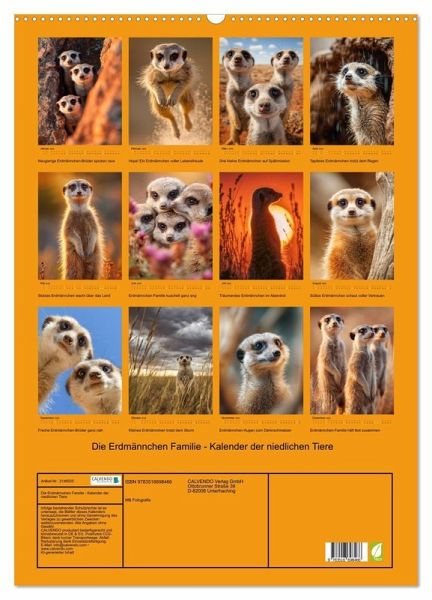 QUALITÄT - Hochwertiger Fotokalender mit 12 wunderschönen Motiven auf lichtbeständigem Bilderdruckpapier, robuste Spiralbindung mit Aufhängebügel.NACHHALTIG - deutliche Abfallreduzierung durch bedarfsgerechte Einzelstückfertigung, umweltfreundliches FSC-zertifiziertes Papier, Produktion in Deutschland, klimabewusste Logistik.PERFEKTES GESCHENK - Kalender für Freunde und Familie, für Kinder und Erwachsene, jung und alt, zu Weihnachten, Geburtstag oder zwischendurch.VIELFALT - Bildkalender in verschiedenen Formaten, z.B. DIN A5, DIN A4, DIN A3 sowie DIN A2. Ob Naturmotiv, Gemälde oder Fotos, ideal für ein persönliches Wohlfühlambiente.Erdmännchen Kalender: Niedliche Tiere - die Erdmännchen-Familie in einzigartigen Bildern. Perfekt als Tierkalender, Familienkalender oder Geschenk. Süßes Highlight für alle Fans von Erdmännchen und niedlichen Tieren. von Autor(in): Michael Bihlmayer