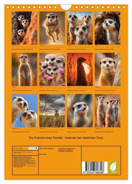 QUALITÄT - Hochwertiger Fotokalender mit 12 wunderschönen Motiven auf lichtbeständigem Bilderdruckpapier, robuste Spiralbindung mit Aufhängebügel.NACHHALTIG - deutliche Abfallreduzierung durch bedarfsgerechte Einzelstückfertigung, umweltfreundliches FSC-zertifiziertes Papier, Produktion in Deutschland, klimabewusste Logistik.PERFEKTES GESCHENK - Kalender für Freunde und Familie, für Kinder und Erwachsene, jung und alt, zu Weihnachten, Geburtstag oder zwischendurch.VIELFALT - Bildkalender in verschiedenen Formaten, z.B. DIN A5, DIN A4, DIN A3 sowie DIN A2. Ob Naturmotiv, Gemälde oder Fotos, ideal für ein persönliches Wohlfühlambiente.Erdmännchen Kalender: Niedliche Tiere - die Erdmännchen-Familie in einzigartigen Bildern. Perfekt als Tierkalender, Familienkalender oder Geschenk. Süßes Highlight für alle Fans von Erdmännchen und niedlichen Tieren. von Autor(in): Michael Bihlmayer