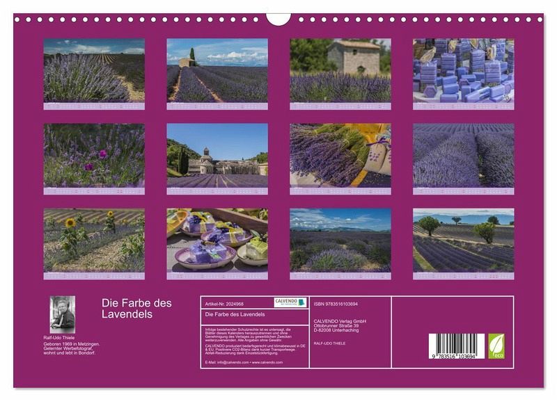 QUALITÄT - Hochwertiger Fotokalender mit 12 wunderschönen Motiven auf lichtbeständigem Bilderdruckpapier, robuste Spiralbindung mit Aufhängebügel.NACHHALTIG - deutliche Abfallreduzierung durch bedarfsgerechte Einzelstückfertigung, umweltfreundliches FSC-zertifiziertes Papier, Produktion in Deutschland, klimabewusste Logistik.PERFEKTES GESCHENK - Kalender für Freunde und Familie, für Kinder und Erwachsene, jung und alt, zu Weihnachten, Geburtstag oder zwischendurch.VIELFALT - Bildkalender in verschiedenen Formaten, z.B. DIN A5, DIN A4, DIN A3 sowie DIN A2. Ob Naturmotiv, Gemälde oder Fotos, ideal für ein persönliches Wohlfühlambiente.Lavendel der Provence von Autor(in): Ralf-Udo Thiele